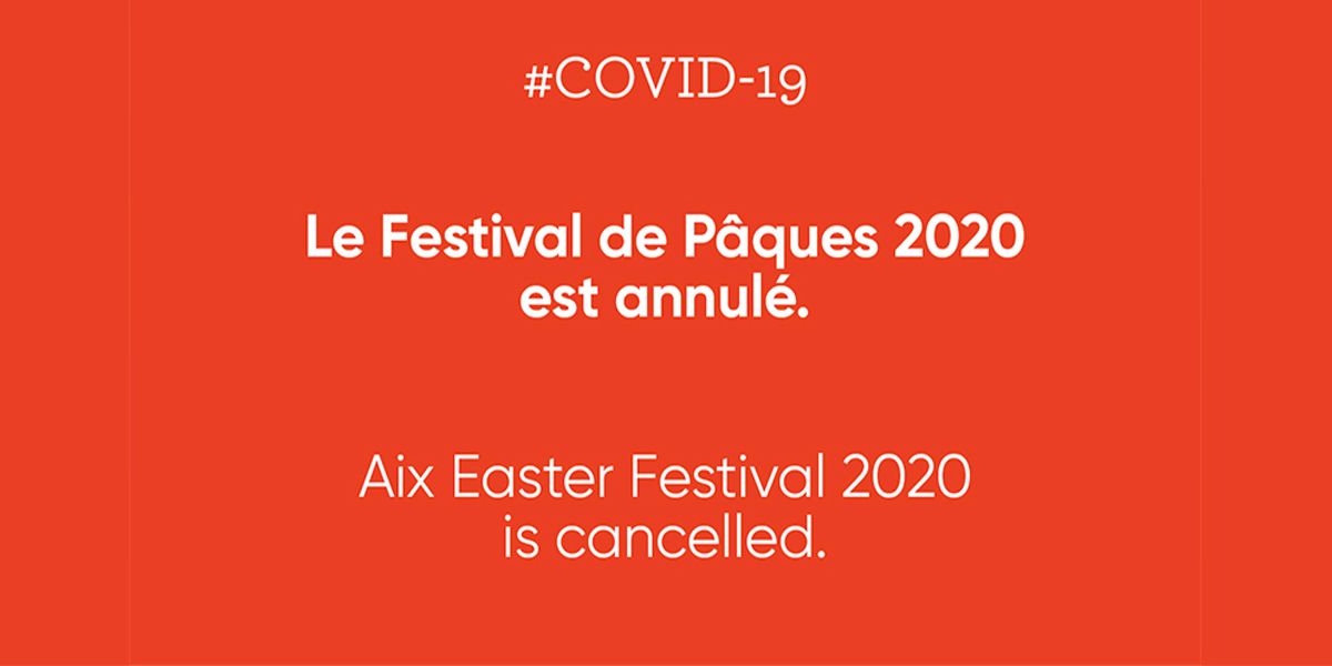Solidaire des décisions prises par les pouvoirs publics et les autorités sanitaires, l'équipe d'organisation du Festival de Pâques d'Aix-en-Provence annule l'édition 2020 prévue du 4 au 19 avril.
